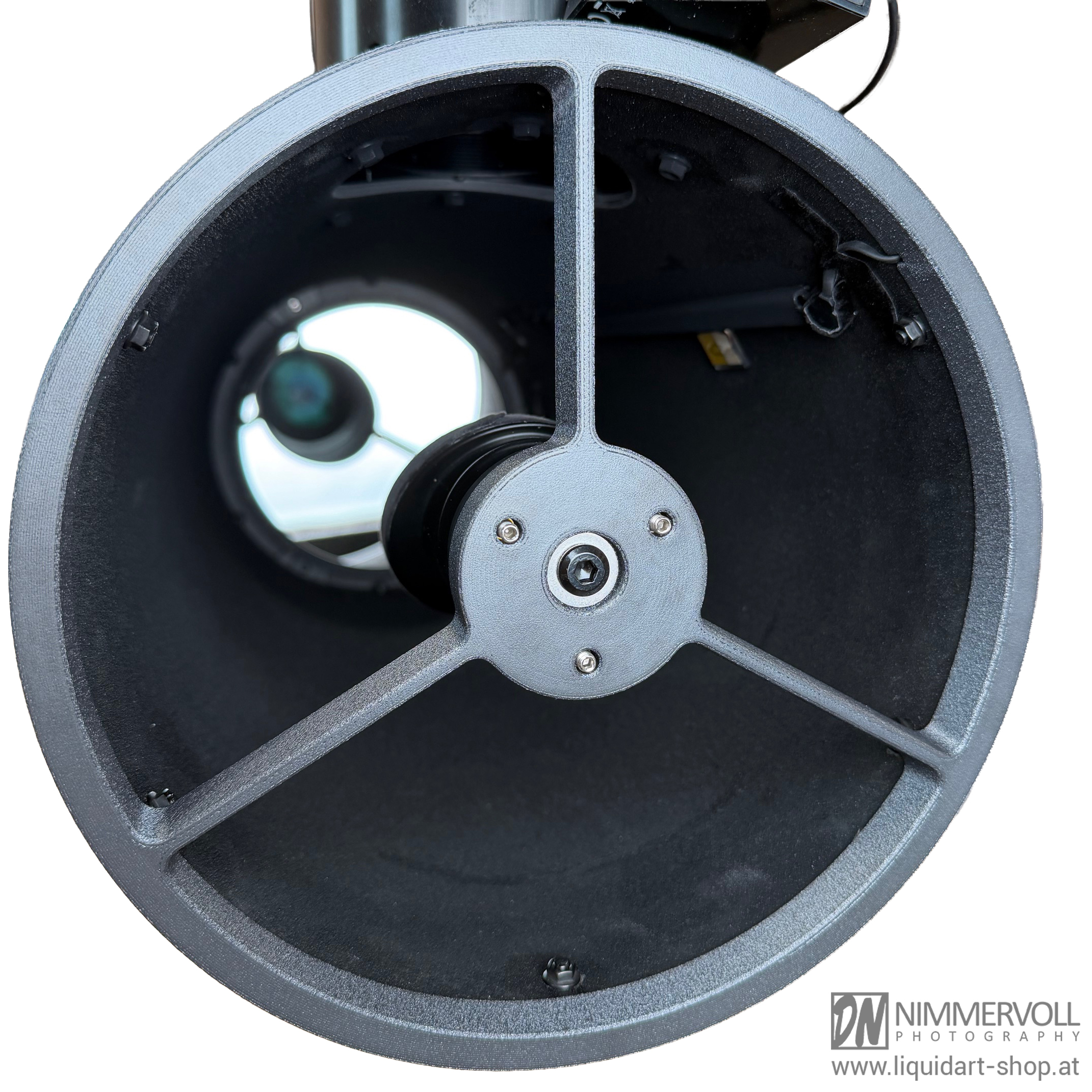 Gefertigt aus dem besonders steifen und langlebigen Hochleistungsmaterial PPS-CF (carbonfaserverstärkt), überzeugt die Fangspiegelspinne durch minimale Materialermüdung und praktisch kein Kriechverhalten – ein entscheidender Vorteil gegenüber vielen herkömmlichen Kunststoffen. Dadurch bleibt die exakte Position des Fangspiegels dauerhaft erhalten, was sich direkt in einer konstant hohen Abbildungsqualität widerspiegelt.